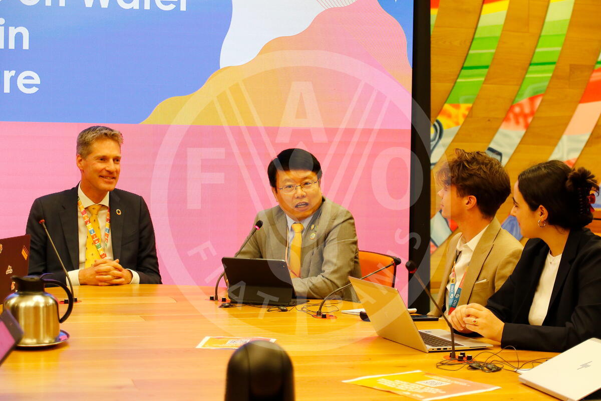 16 October 2024. Ethiopia Room, FAO Headquarters, Rome, Italy. Marcel Beukeboom, Permanent Representative of the Kingdom of the Netherlands to the United Nations Organisations in Rome, and Li Lifeng, the Director of Land and Water Division, Food Agriculture Organization of the United Nations (FAO), addressing the water dialogue (thematic youth assembly session