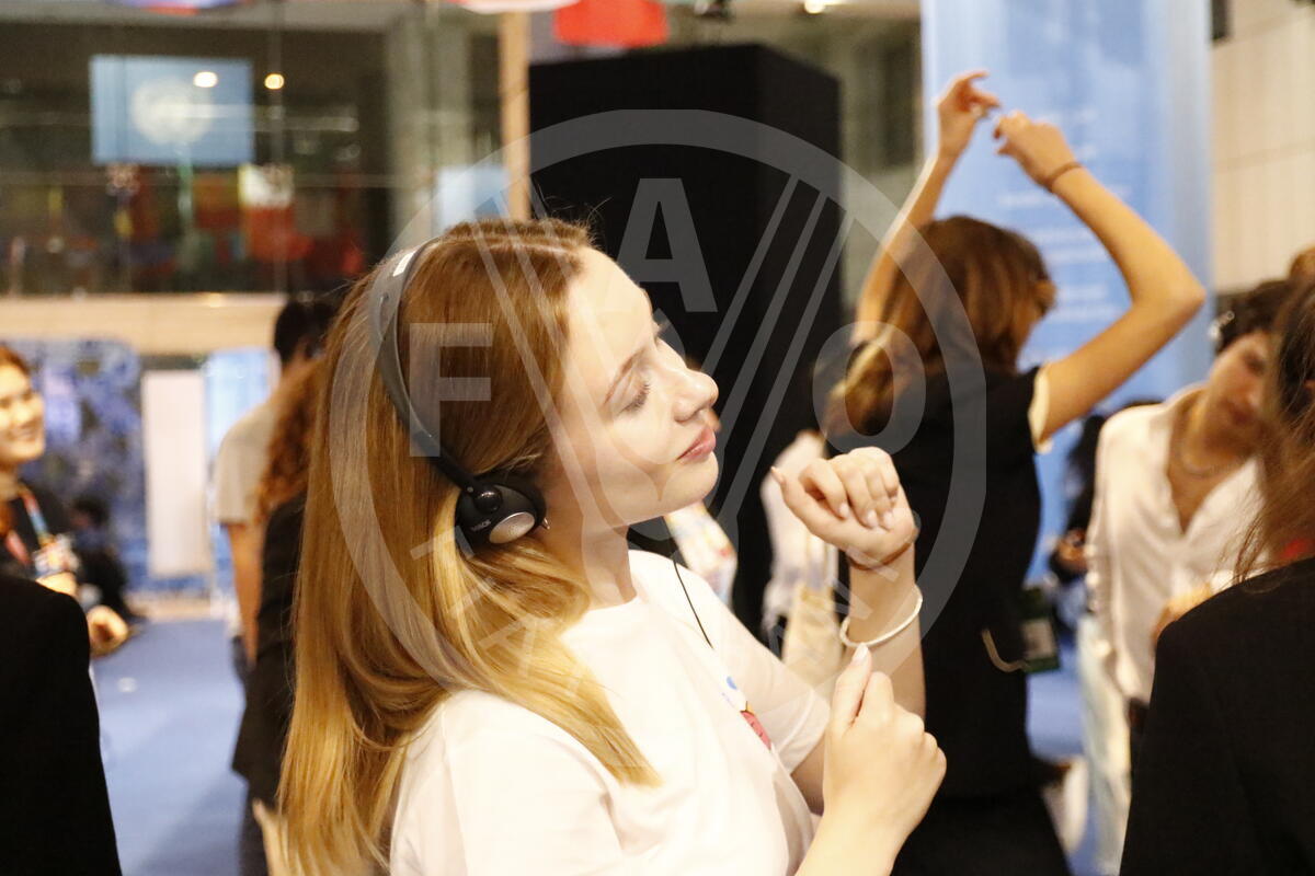 16 October 2024. Culture Corner, FAO Headquarters, Rome, Italy. At the World Food Forum 2024, on World Food Day, participants and delegates unwind during a silent disco held after the days proceedings.