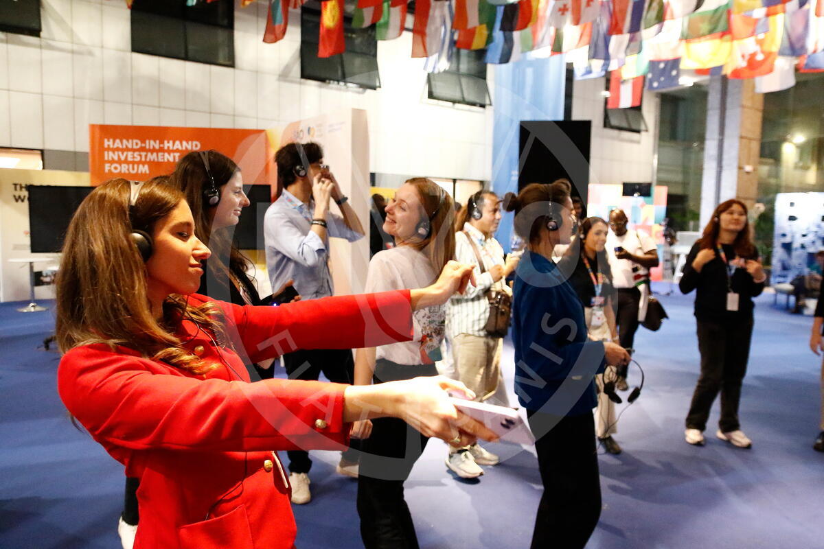 16 October 2024. Culture Corner, FAO Headquarters, Rome, Italy. At the World Food Forum 2024, on World Food Day, participants and delegates unwind during a silent disco held after the days proceedings.