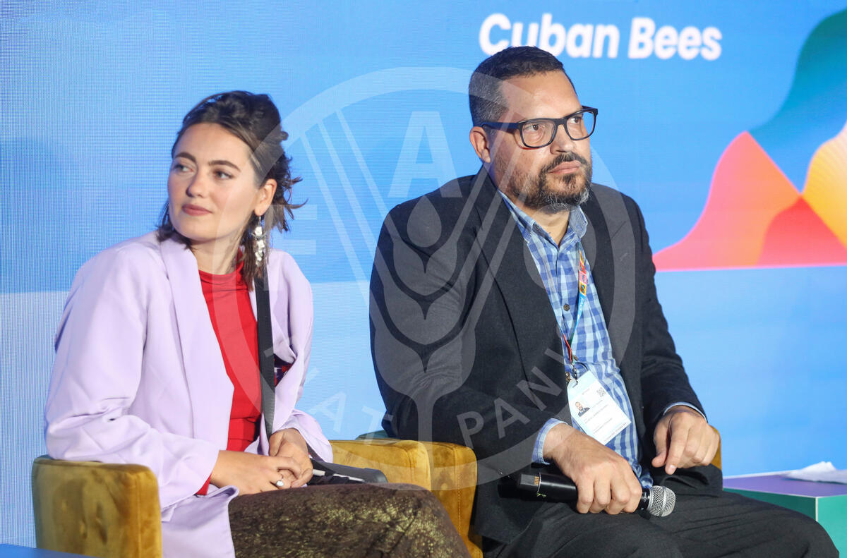 16 October 2024. Sheikh Zayed Centre, FAO Headquarters, Rome, Italy. View of the panelists addressing the World Food Forum Film Festival 2024.