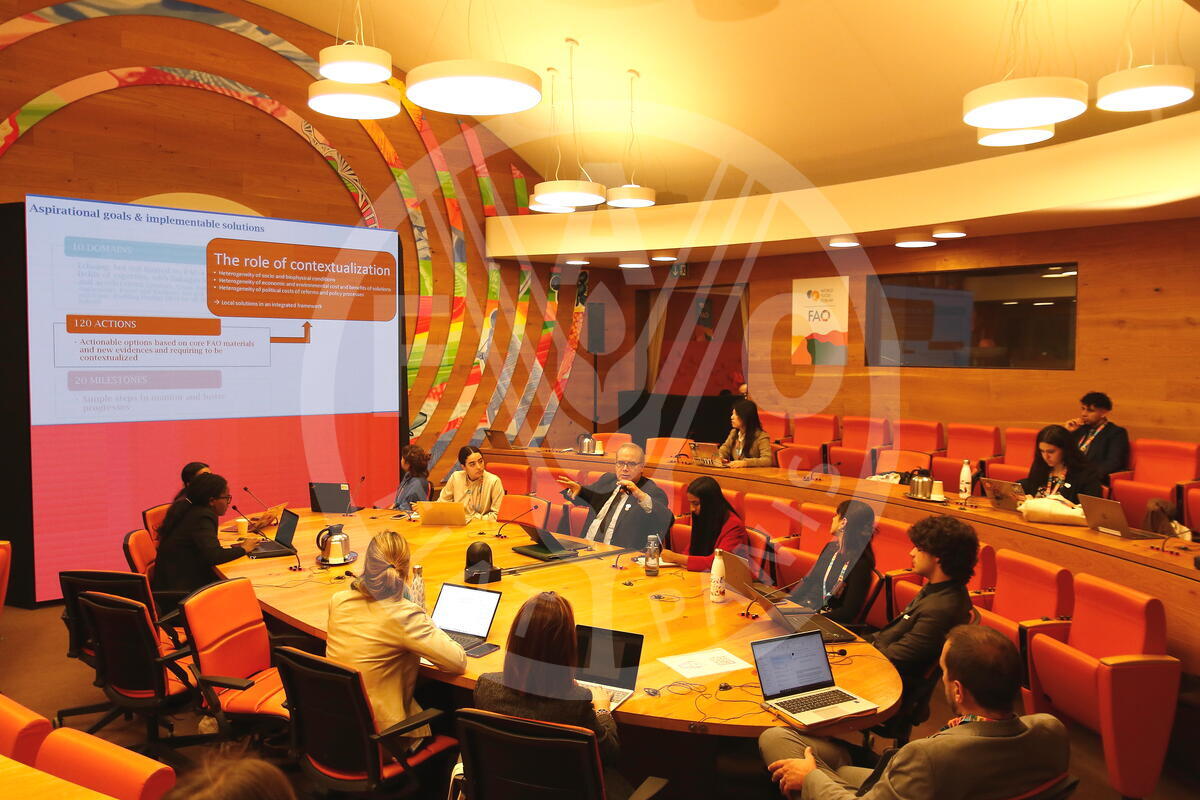17 October 2024. Ethiopia Room, FAO Headquarters, Rome, Italy. View of the panelists and participants at the thematic youth assembly session: 1.5 Degrees Roadmap.