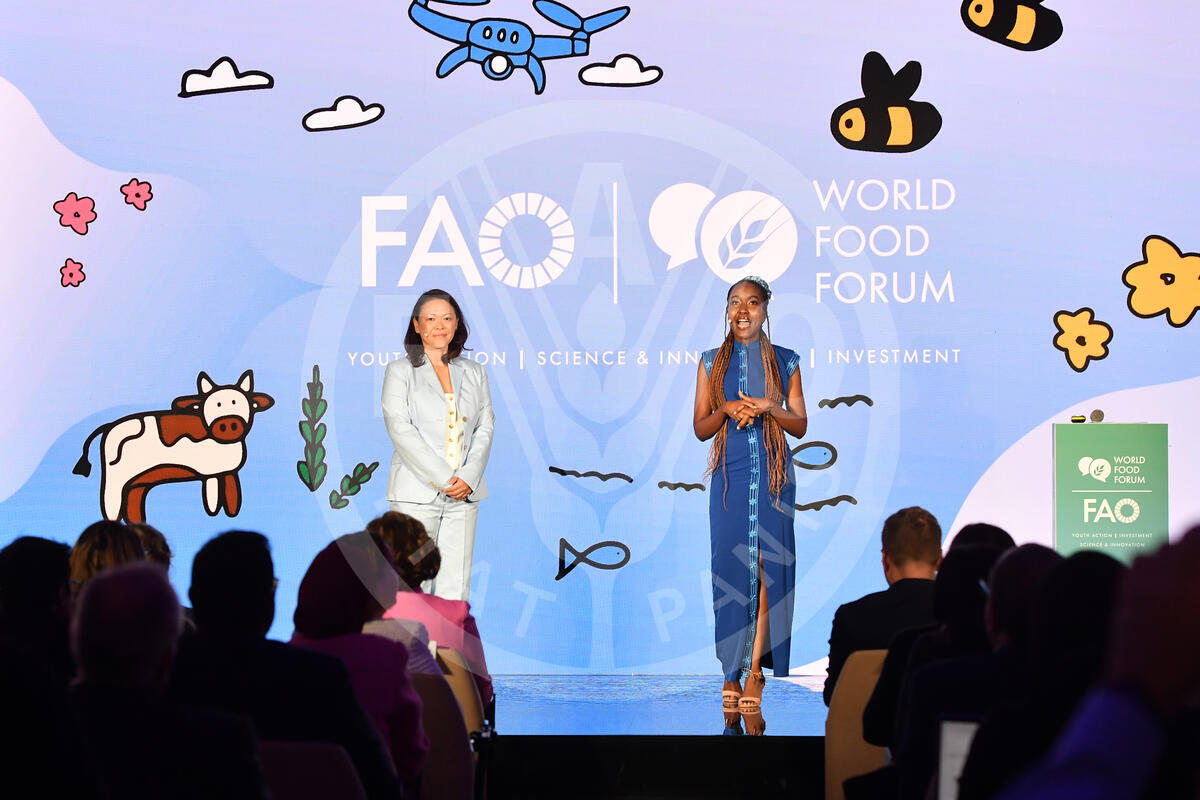 16 October 2024. Sheikh Zayed Centre, FAO Headquarters, Rome, Italy. Nancy Yuan (Strategic Program Manager), and Amanda Namayi (Youth Advocate for Zero Hunger), present the Startup Innovation Awards.