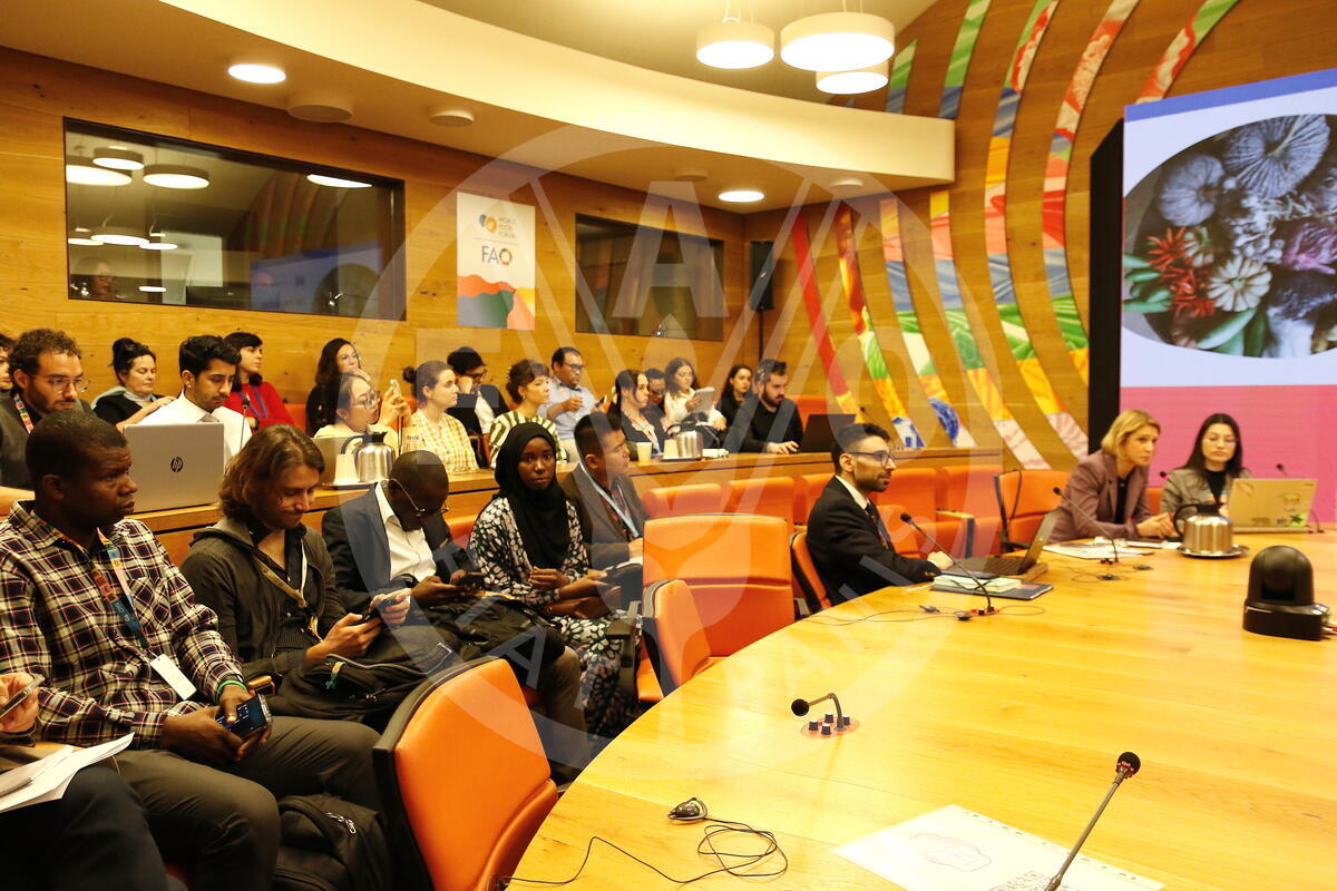 17 October 2024. Ethiopia Room, FAO Headquarters, Rome, Italy. A wide, general view of the event at the World Food Forum, showcasing international delegates, youth leaders, and FAO officials engaging in discussions on agrifood systems transformation.