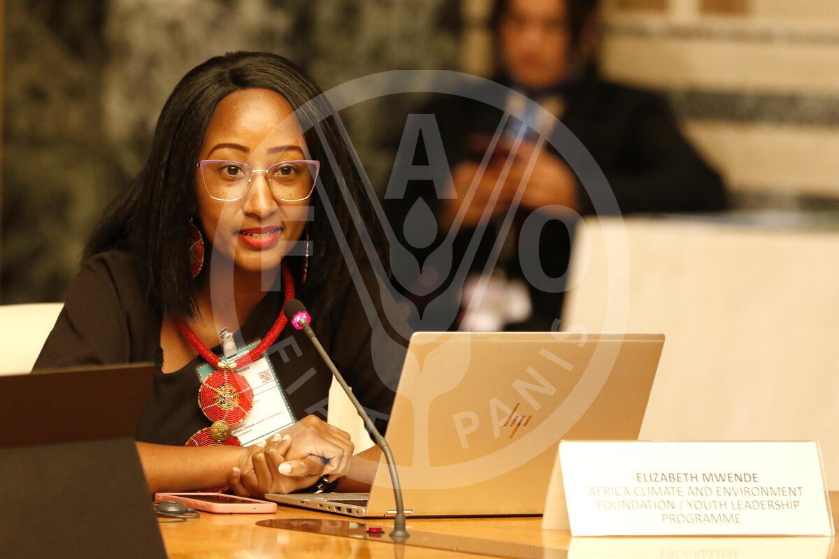 17 October 2024. King Faisal, FAO Headquarters, Rome, Italy. Elizabeth Mwende, Youth Representative at the UN Food Systems Coordination Hub and volunteer at the Africa Climate and Environment Foundation, gives her speech at Multilevel Action: Leveraging international processes for youth empowerment