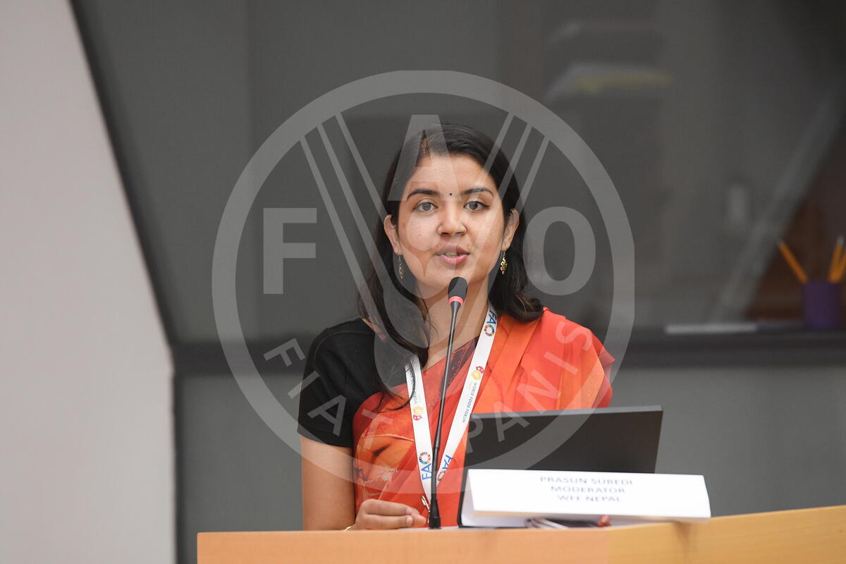 17 October 2024. German Room, FAO Headquarters, Rome, Italy. Prasun Subedi, representing the World Food Forum Nepal Chapter, serves as the moderator of the dialogue.
