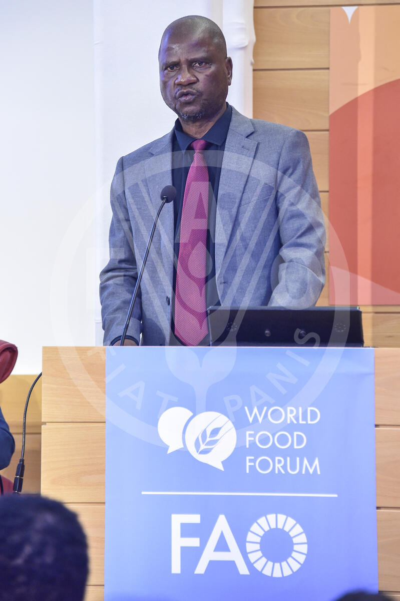 15 October 2024. Austria Room, FAO Headquarters, Rome, Italy. Hon. Mandla Tshawuka, the Minister of Agriculture of the Kingdom of Eswatini, talks at the World Food Forum Southern Africa presentations of the Hand-in-Hand Regional Initiatives investment plans in the Austria Room. The Hand-in-Hand initiative aims at facilitating partnerships and investments to accelerate the transformation of agrifood systems in the region. In Southern Africa, the initiative targets regions with high rates of poverty and untapped potential for commercially oriented value chain development, as well as different commodities and value chains such as grains, poultry, fisheries, micro-irrigation, mechanization, among others.