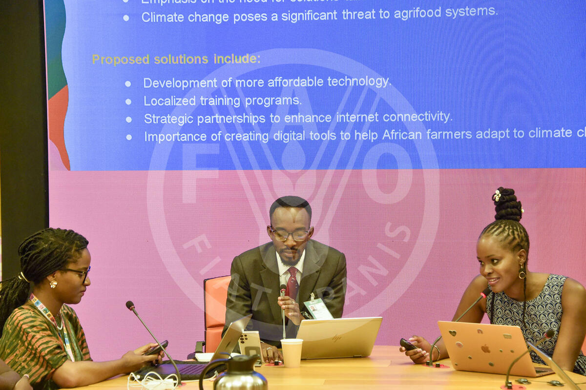 15 October 2024. Ethiopia Room, FAO Headquarters, Rome, Italy. (L-R): Jennifer Eloundou, Seth Charles Mkisi and Andile Mnguni, moderators at Africa Regional Youth Assembly Workshop.