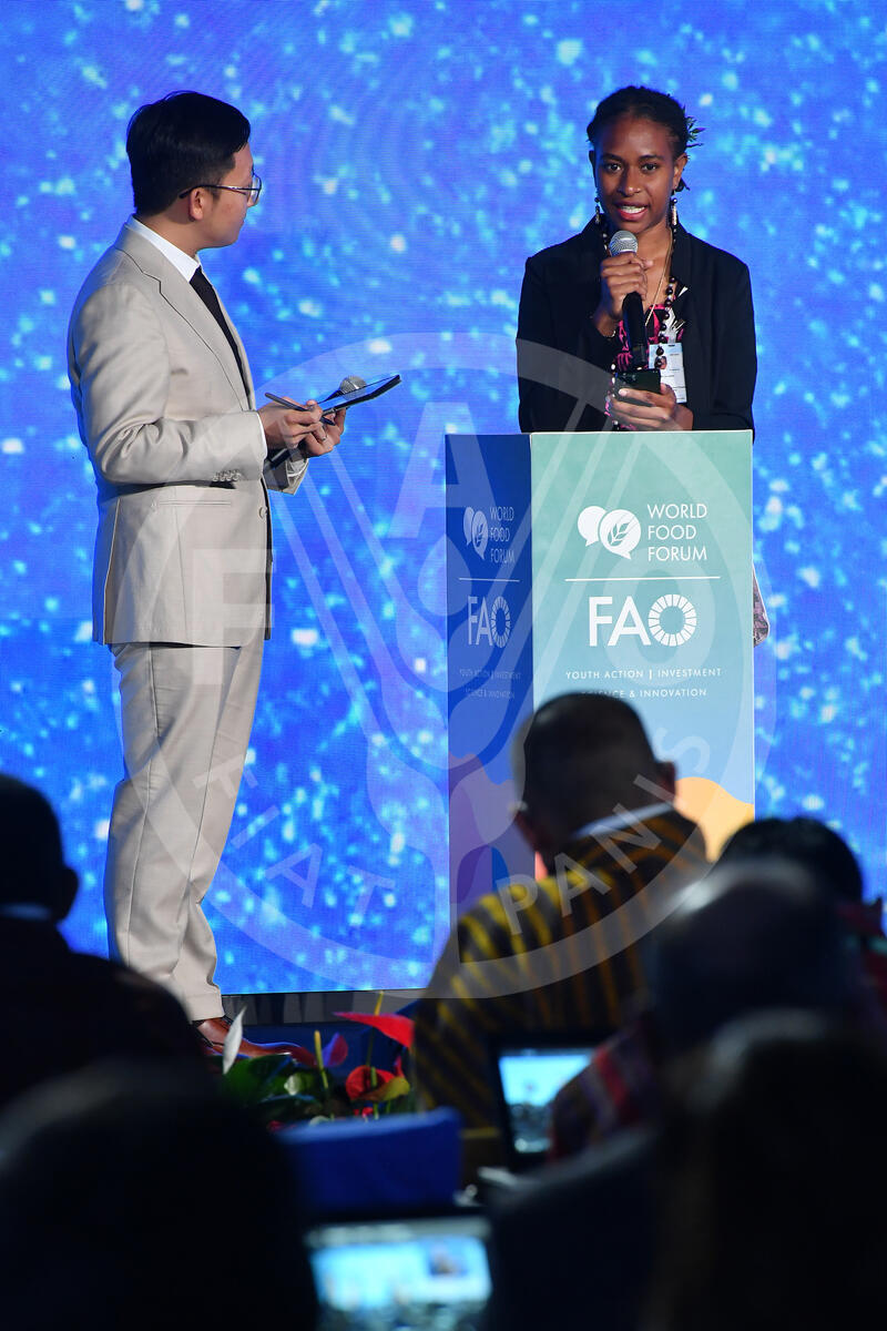 14 October 2024. Plenary Hall, FAO Headquarters, Rome, Italy. Lisa Nellie Tamtam, Representative of Indigenous Youth, speaks at the World Food Forum Grand Opening.