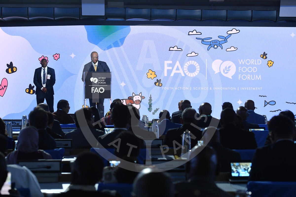 14 October 2024. Plenary Hall, FAO Headquarters, Rome, Italy. King Mswati III of Eswatini speaks to attendees during the World Food Forum Grand Opening Ceremony.
