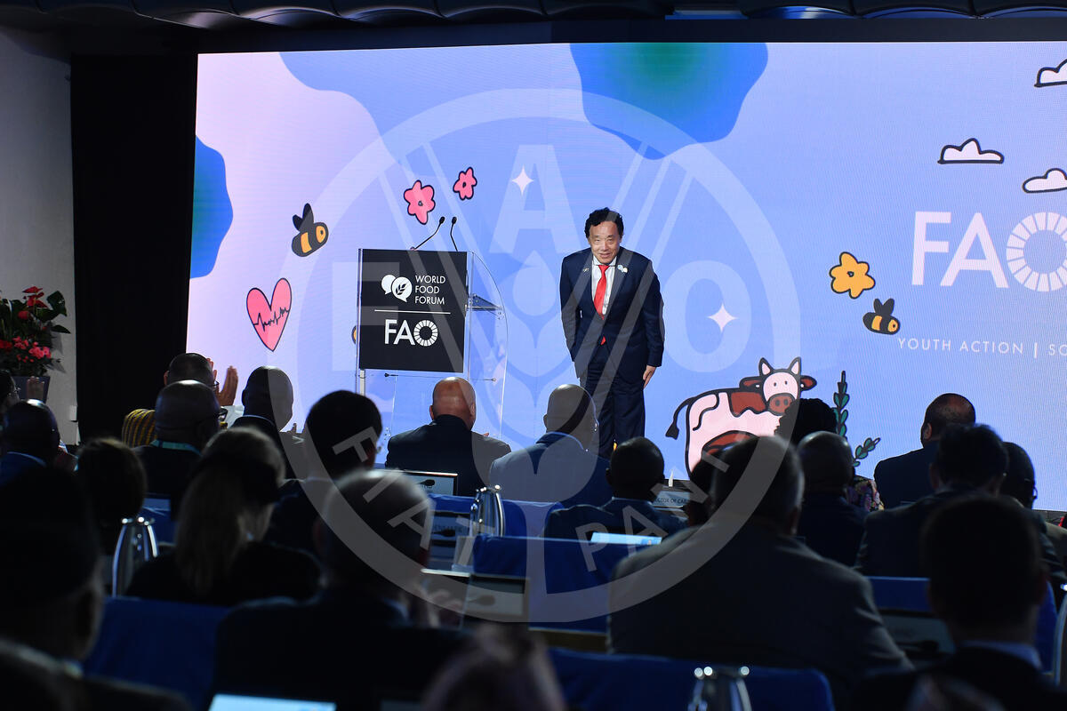 14 October 2024. Plenary Hall, FAO Headquarters, Rome, Italy. QU Dongyu, FAO Director-General, greets the audience at the World Food Forum Grand Opening.
