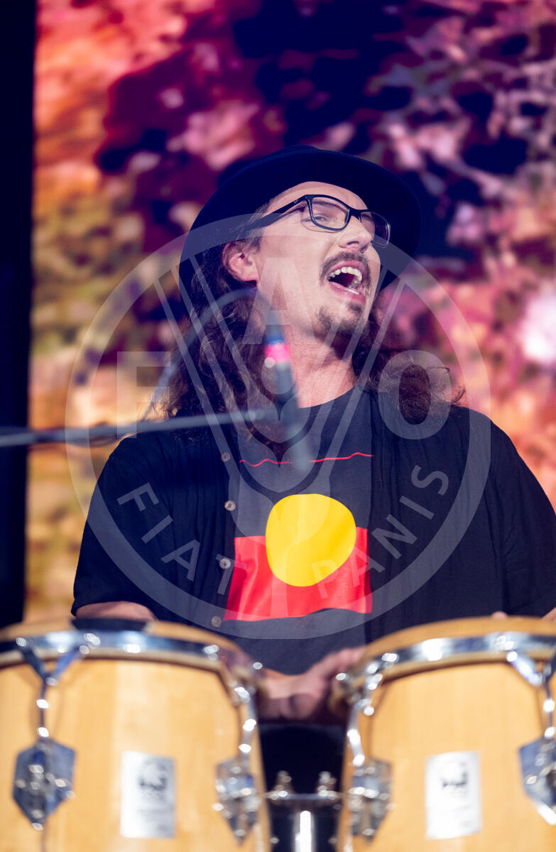14 October 2024. Sheikh Zayed Centre, FAO Headquarters, Rome, Italy. The Australian band Family Shoveller performs with traditional Australian instruments at the WFF Youth Concert.