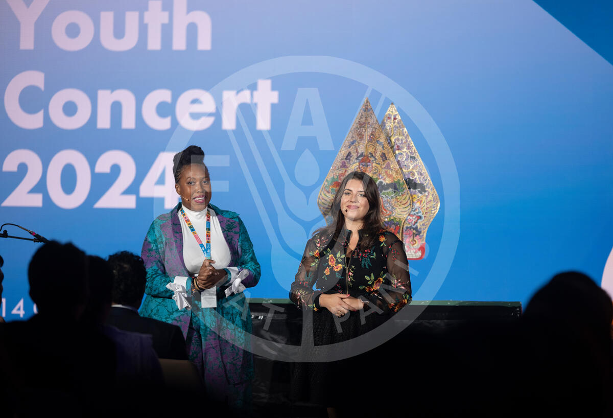 14 October 2024. Sheikh Zayed Centre, FAO Headquarters, Rome, Italy. (L-R) Moderator Rachel Victoria Brown and Lindsey Hook speak at the WFF Youth Concert.