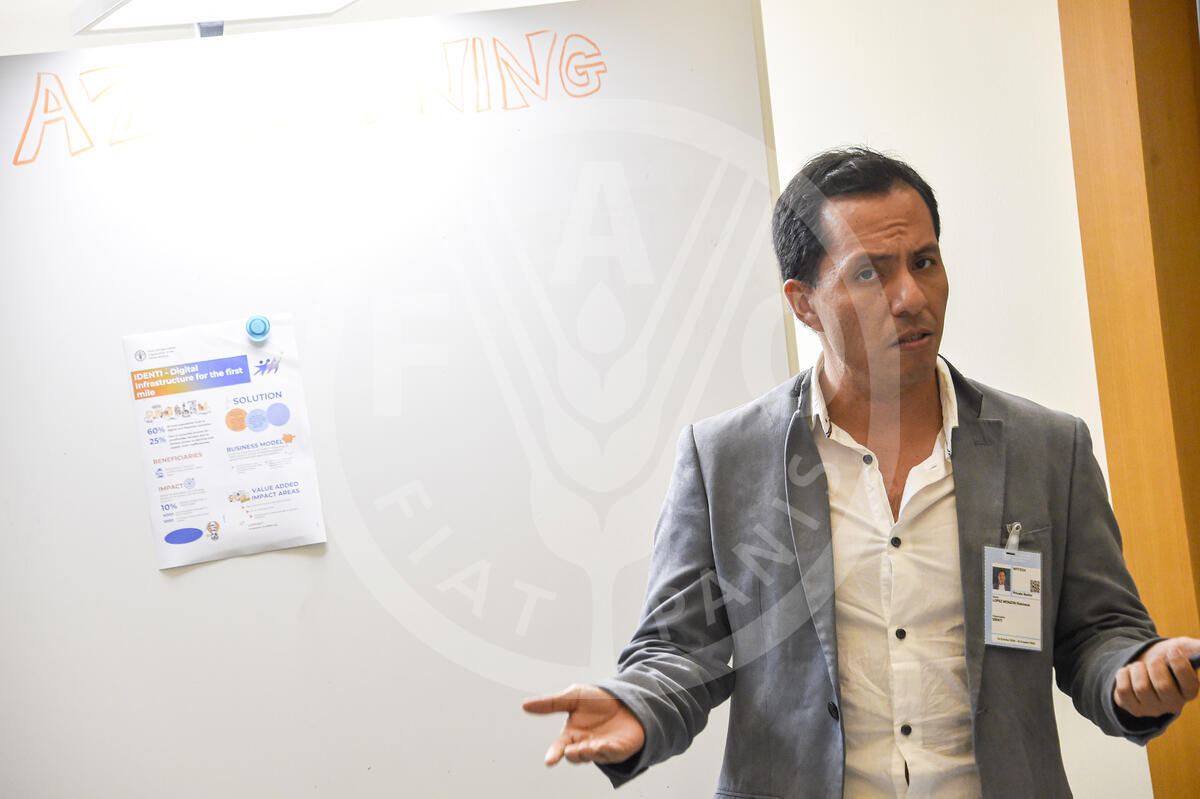 16 October 2024. Acceleration Zone, FAO Headquarters, Rome Italy. Robinson Lòpez, Founder & President of Identi Digital, presents his startup's idea at the Innovation Show and Share Time at the Science and Innovation Lab.