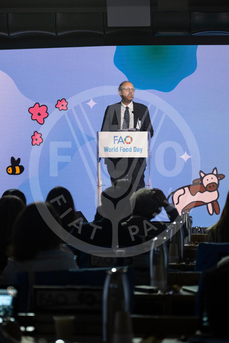 16 October 2024. Plenary Hall, FAO Headquarters, Rome, Italy. Michael Kremer, Director, Development Innovation Lab, University of Chicago (Nobel Prize Laureate), gives his speech at the Science and Innovation Forum 2024.