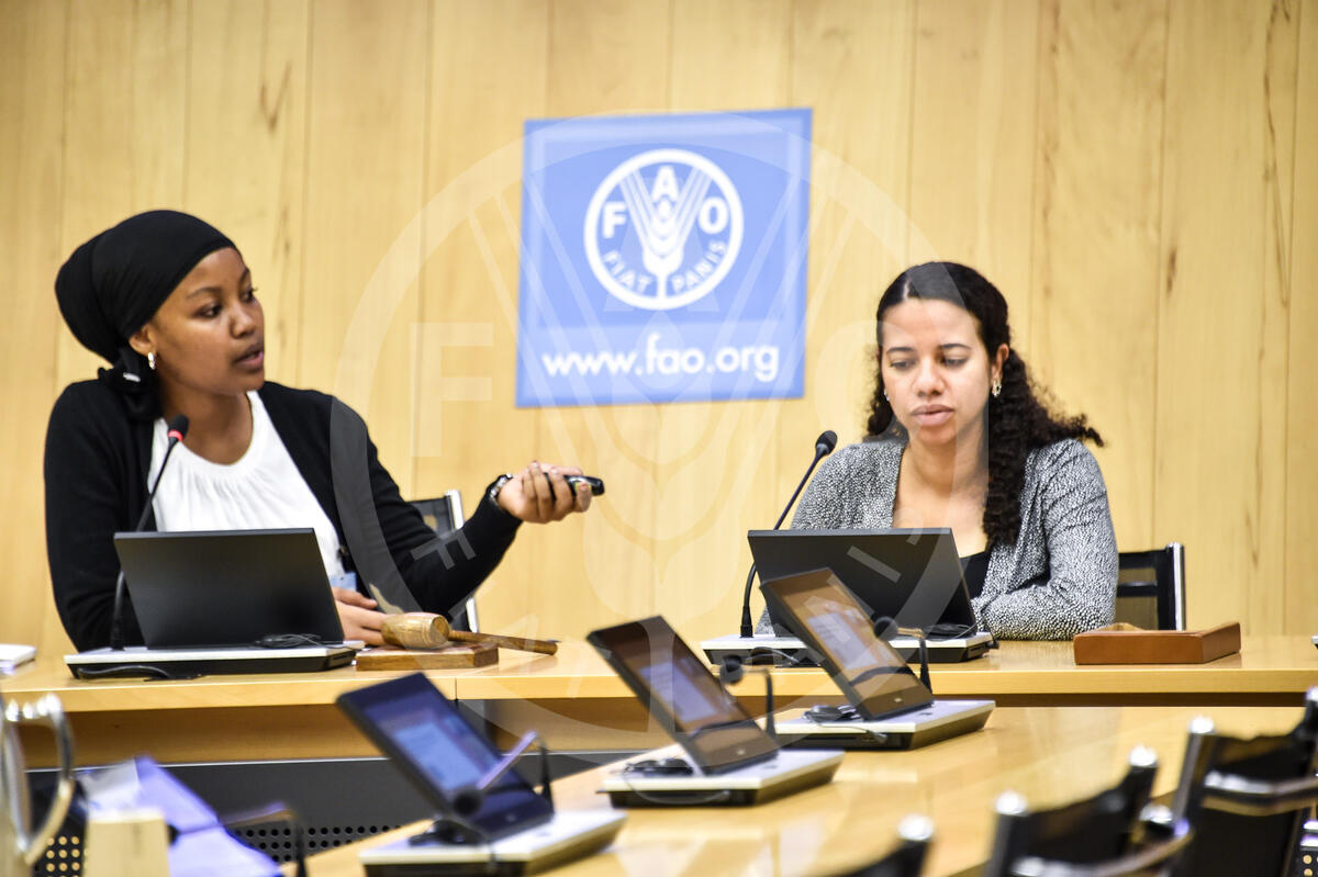 16 October 2024. German Room, FAO Headquarters, Rome, Italy. View of the Moderator (Left) and the Panelist (Right) of Investing in capability building of African youth in Agrifood Science.