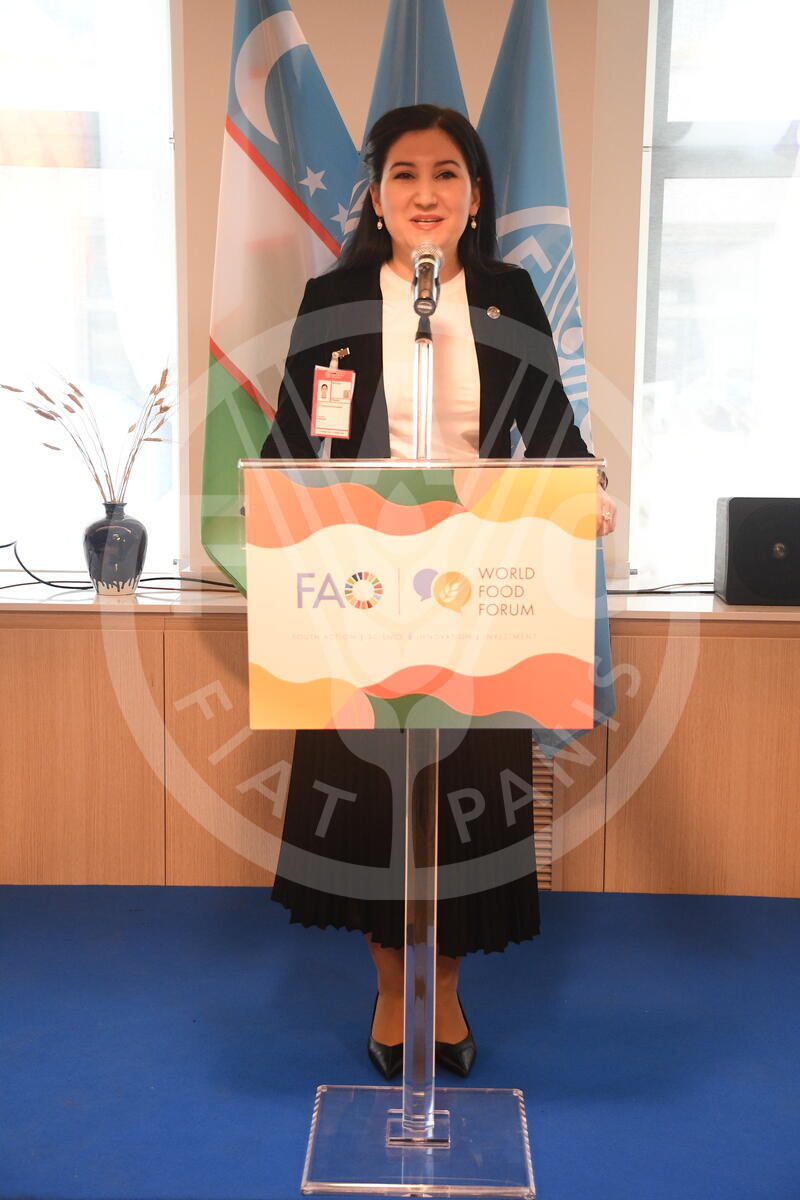 16 October 2024. Uzbekistan Lounge, FAO Headquarters, Rome, Italy. Dilnozakhon Kattakhanova, First Deputy Director of Youth Affairs Agency of Uzbekistan, gives her speech at Uzbekistan Lunch: Culture Meets Innovation event.