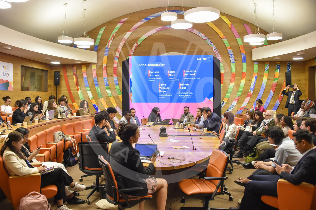 16 October 2024. Ethiopia Room, FAO headquarters, Rome, Italy. View of the speakers and participants at the Near East and North Africa Regional Youth Assembly Workshop.