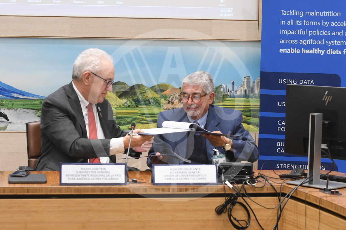 18 October 2024. Philippines Room, World Food Forum, FAO Headquarters, Rome, Italy. Strengthening Capacities in Latin America and the Caribbean: Cooperation and academic alliances. Mr Roberto Escalante and Mr Mario Lubetkin, FAO Assistant Director-General/Regional Representative for Latin America and the Carribbean.