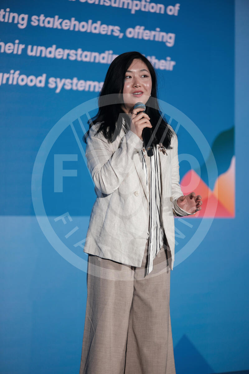 18 October 2024. Sheikh Zayed Centre, FAO Headquarters, Rome, Italy. Yuhan Zheng, representing Asia and Pacific region, gives her speech at the World Food Forum Youth Assembly Global Action Plan Launch.